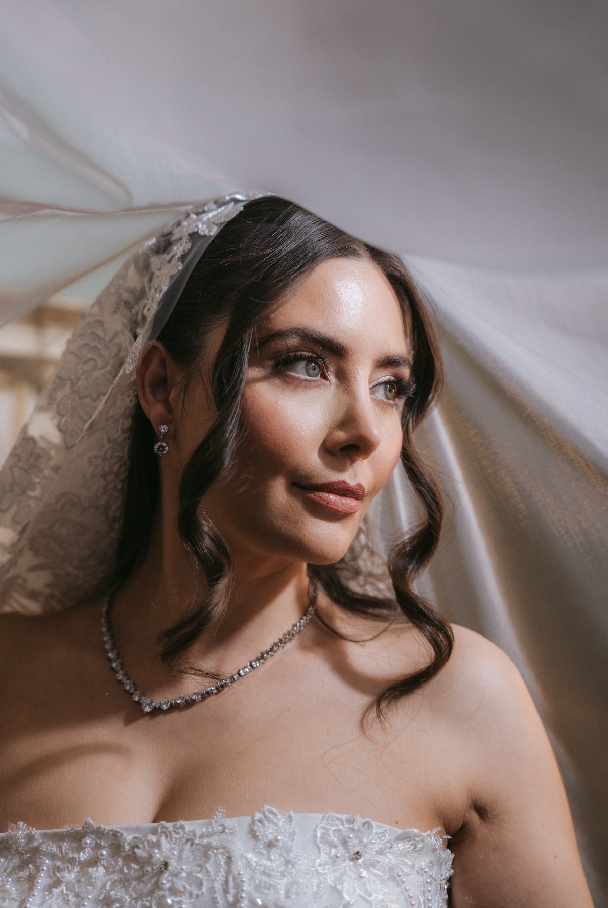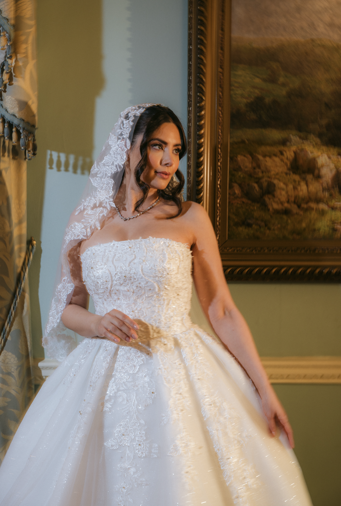 Paired with a stunning lace-edged veil, this gown is the perfect blend of classic romance and modern sophistication.