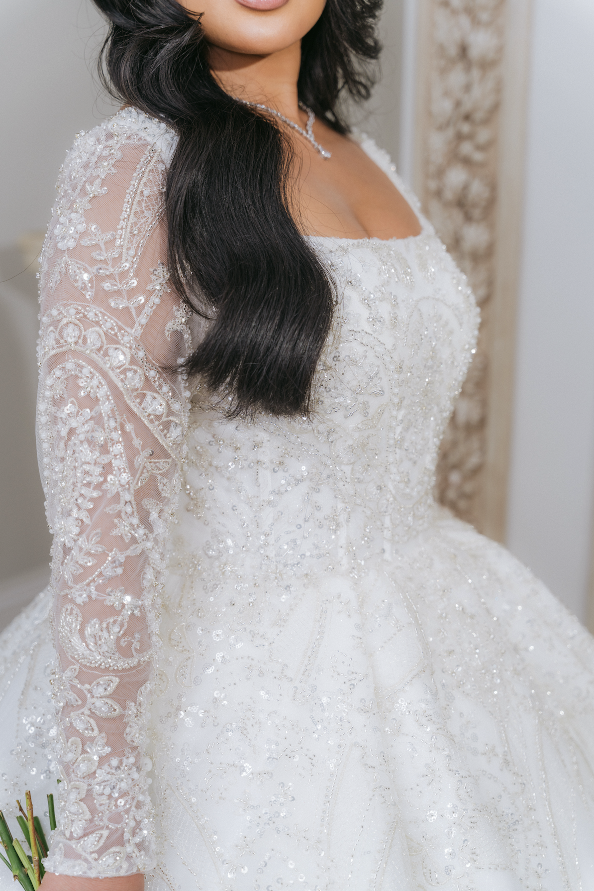 Both modest and statement-making, this gown is ideal for brides seeking a dress that blends cultural roots with couture refinement.