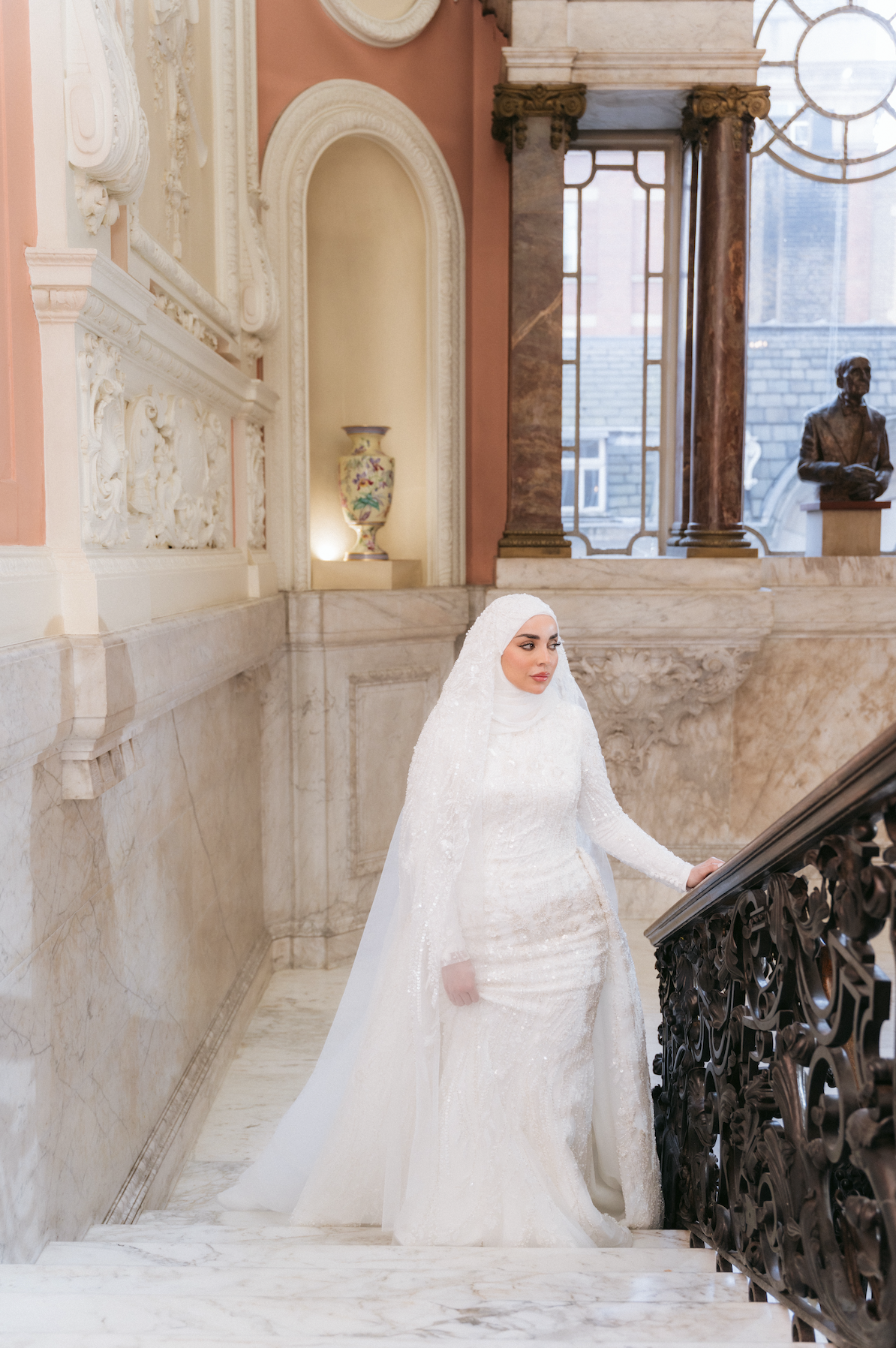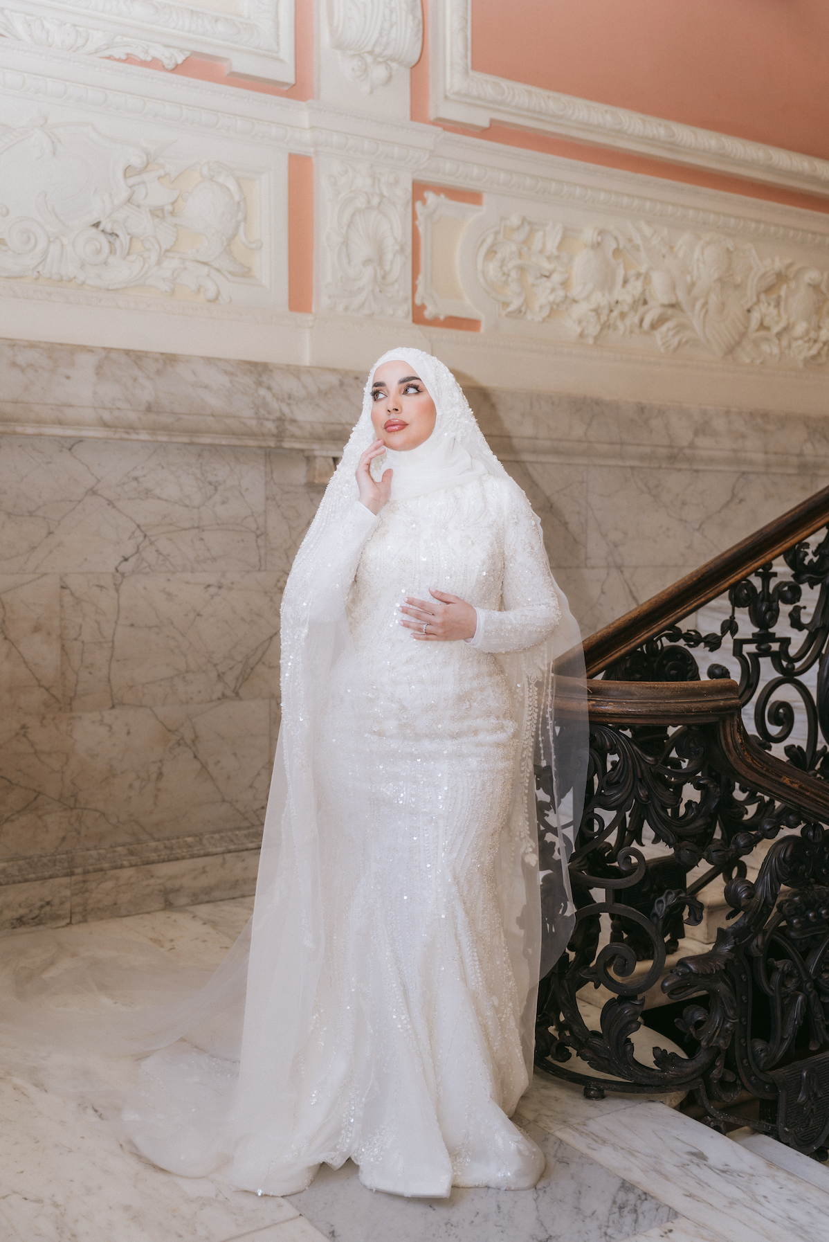 Designed with full coverage, this modest bridal masterpiece sparkles from every angle thanks to its intricate beaded embellishments and all-over sequin detailing.