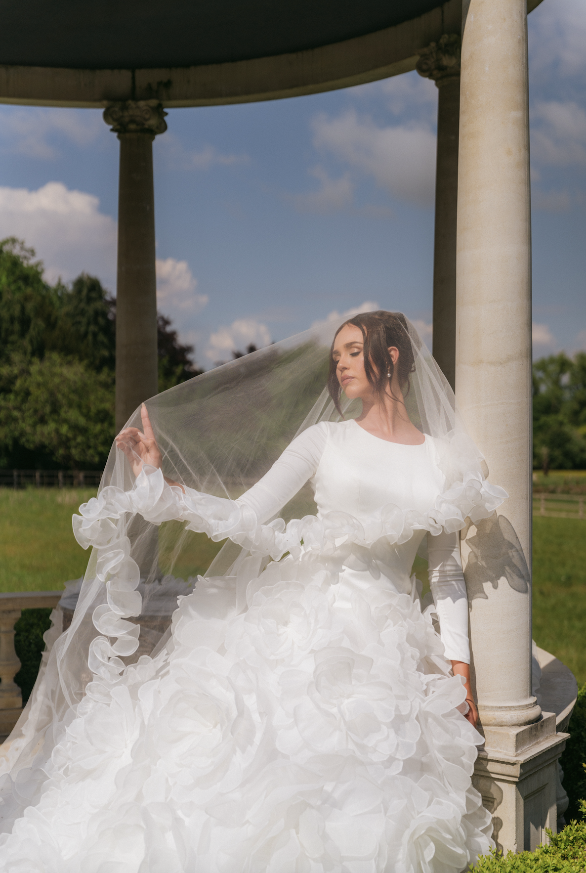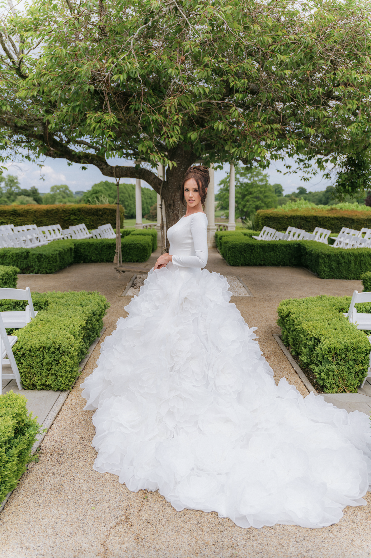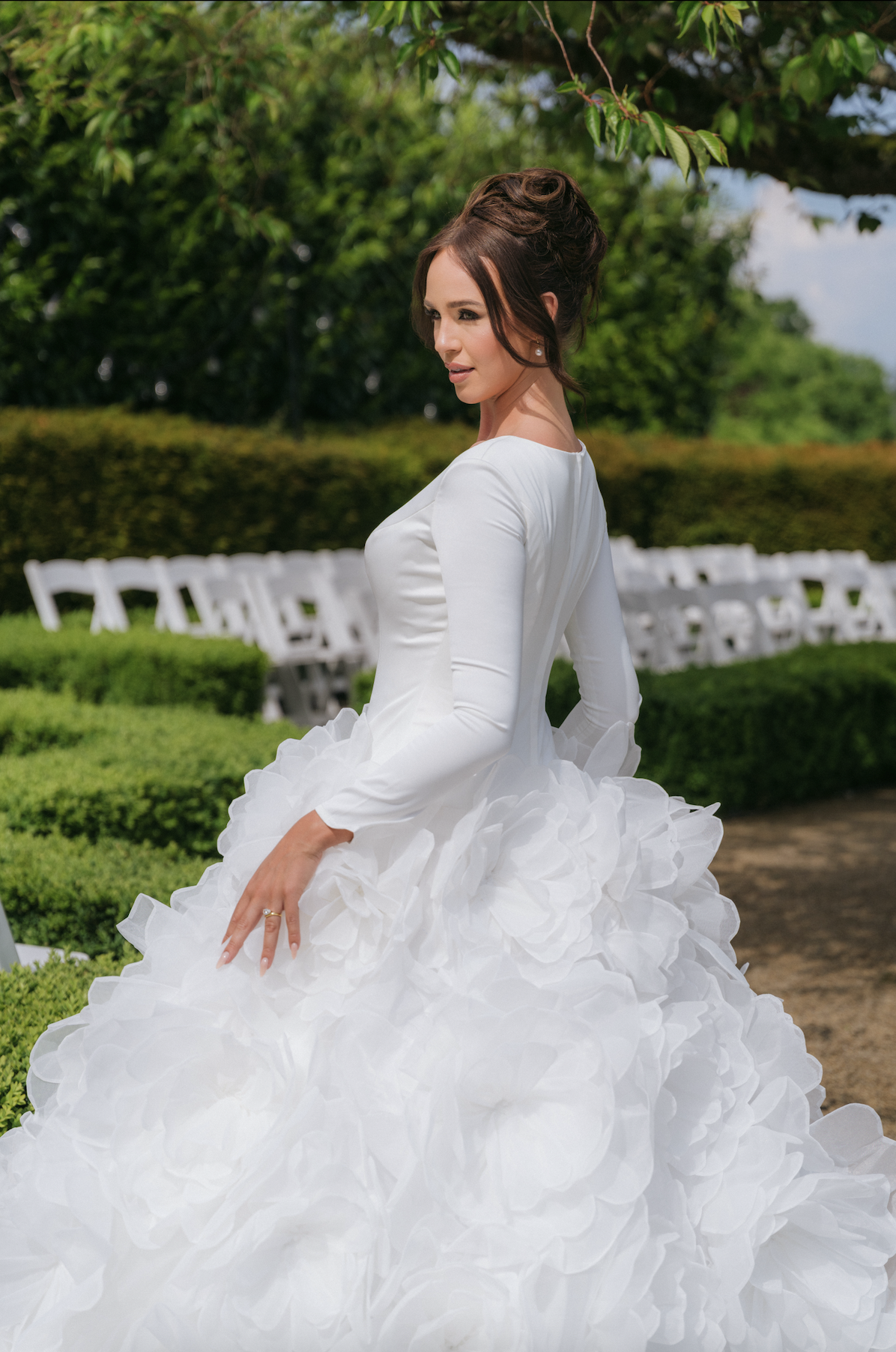 hand-layered to resemble blooming dahlia petals in full flourish. The voluminous skirt and dramatic train flow with weightless grace, making every step feel like a cinematic moment.