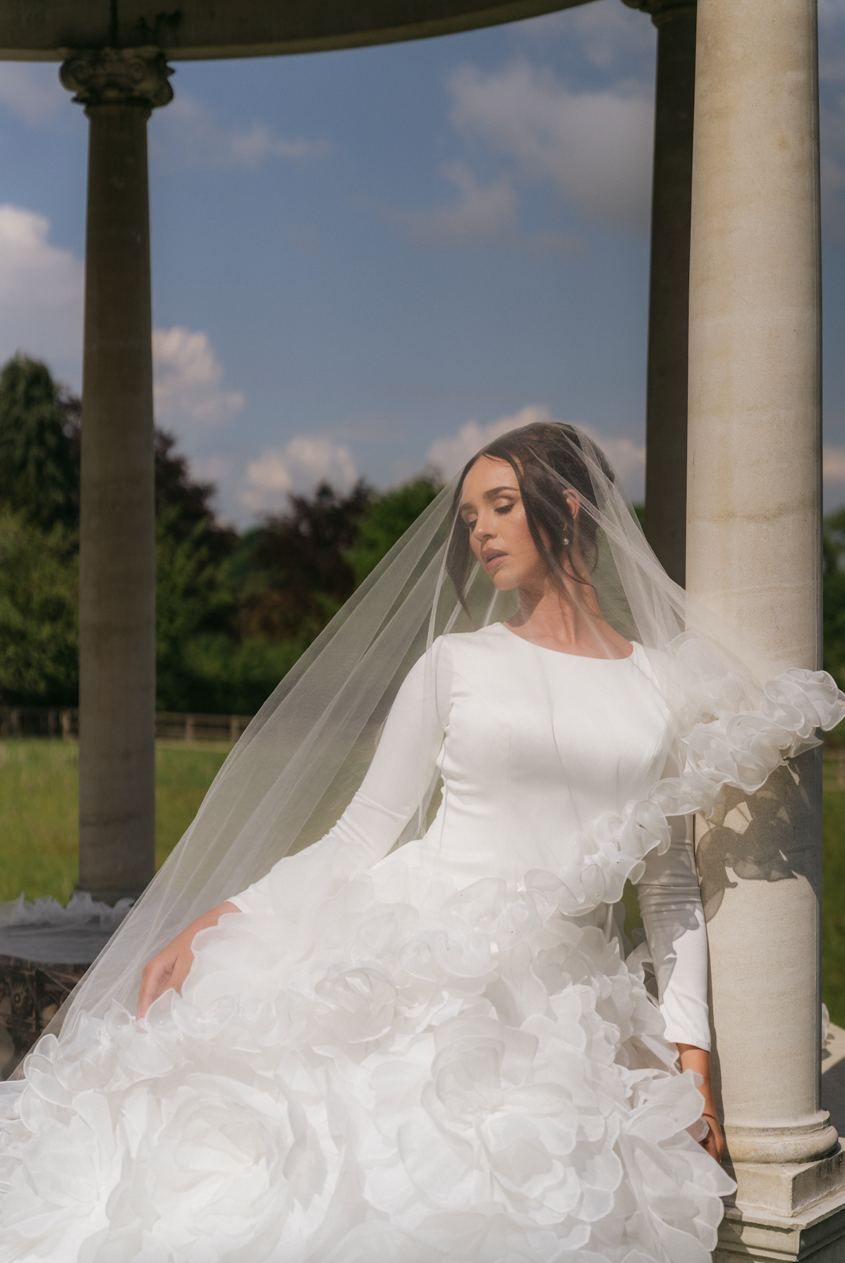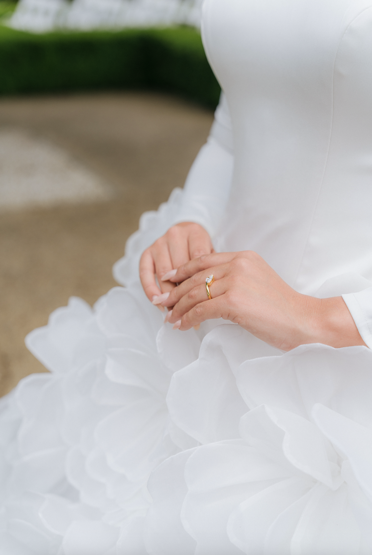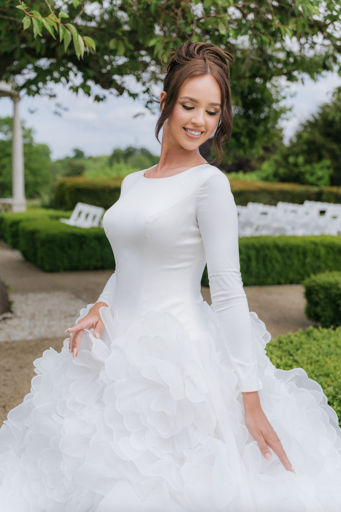 hand-layered to resemble blooming dahlia petals in full flourish. The voluminous skirt and dramatic train flow with weightless grace, making every step feel like a cinematic moment.
