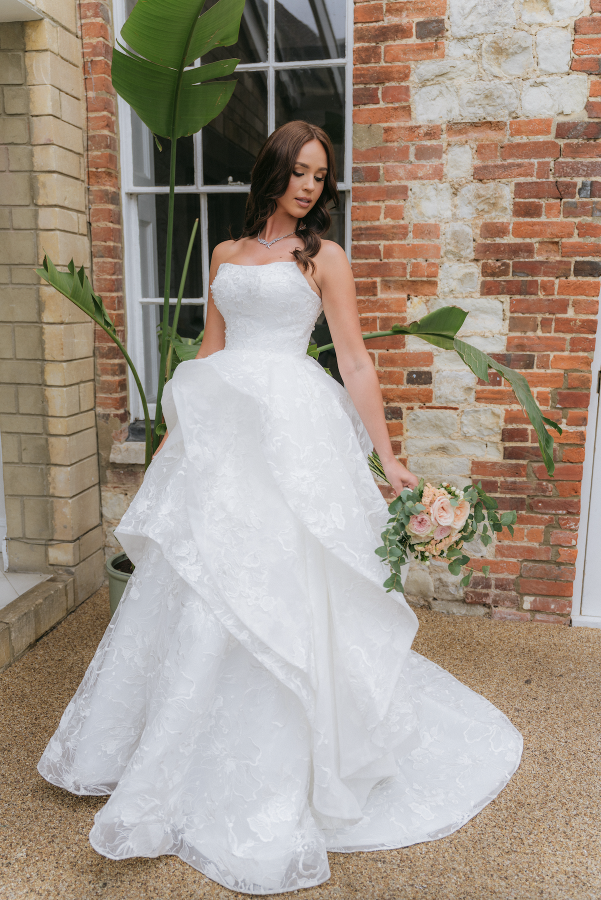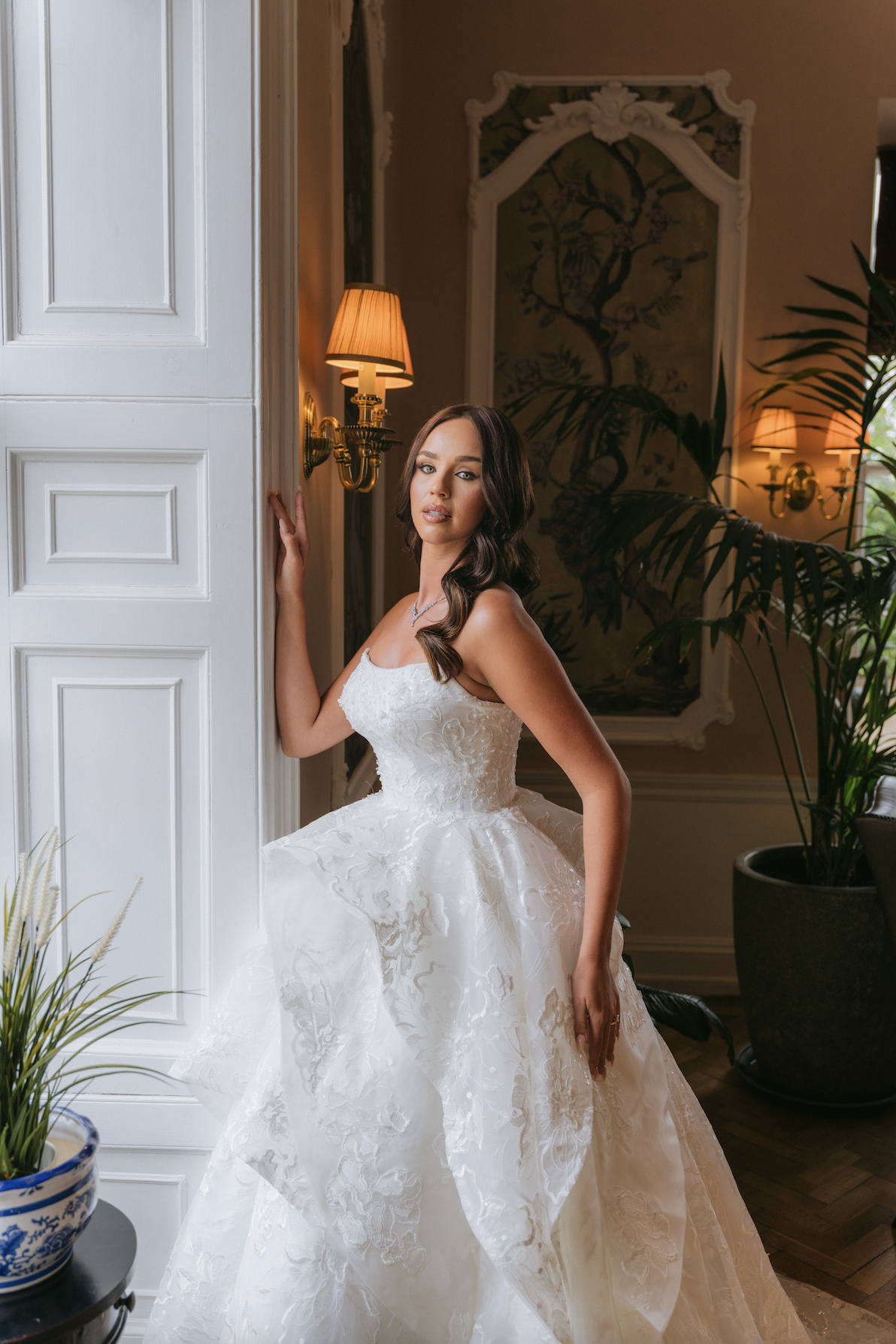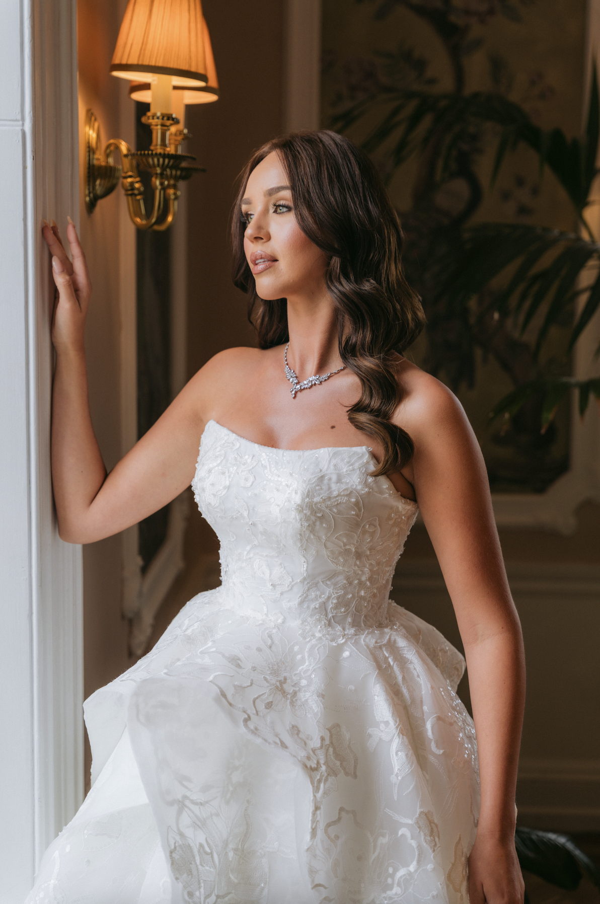 Designed for the bride who dreams in florals, this strapless ballgown blooms with dimensional embroidery and soft cascading textures.