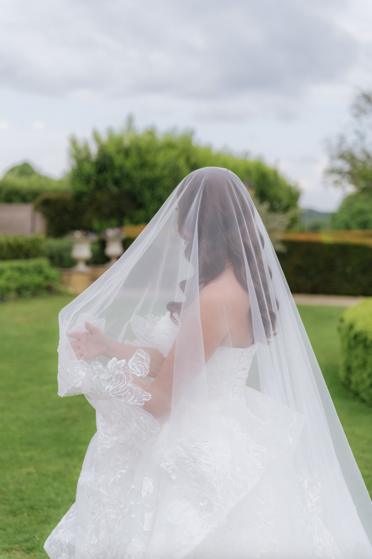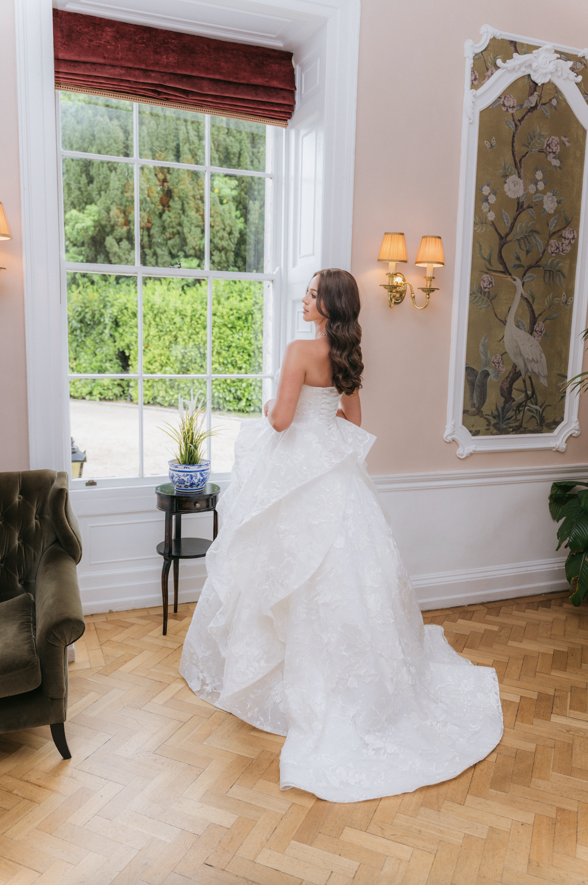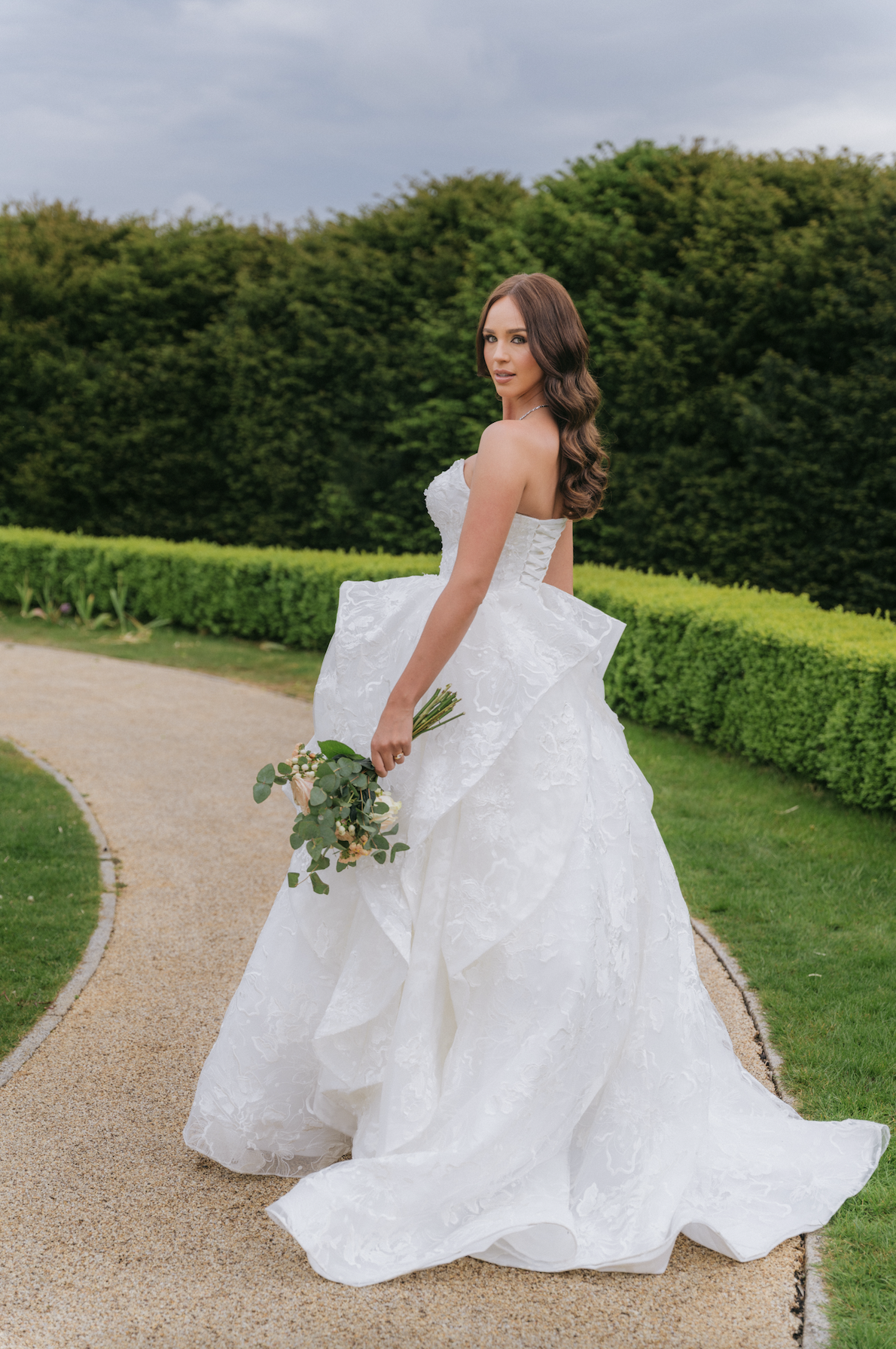 The back of the gown flows into a graceful train, offering drama without overwhelming the silhouette. Florence is both regal and romantic—a celebration of nature’s elegance translated into bridal couture.