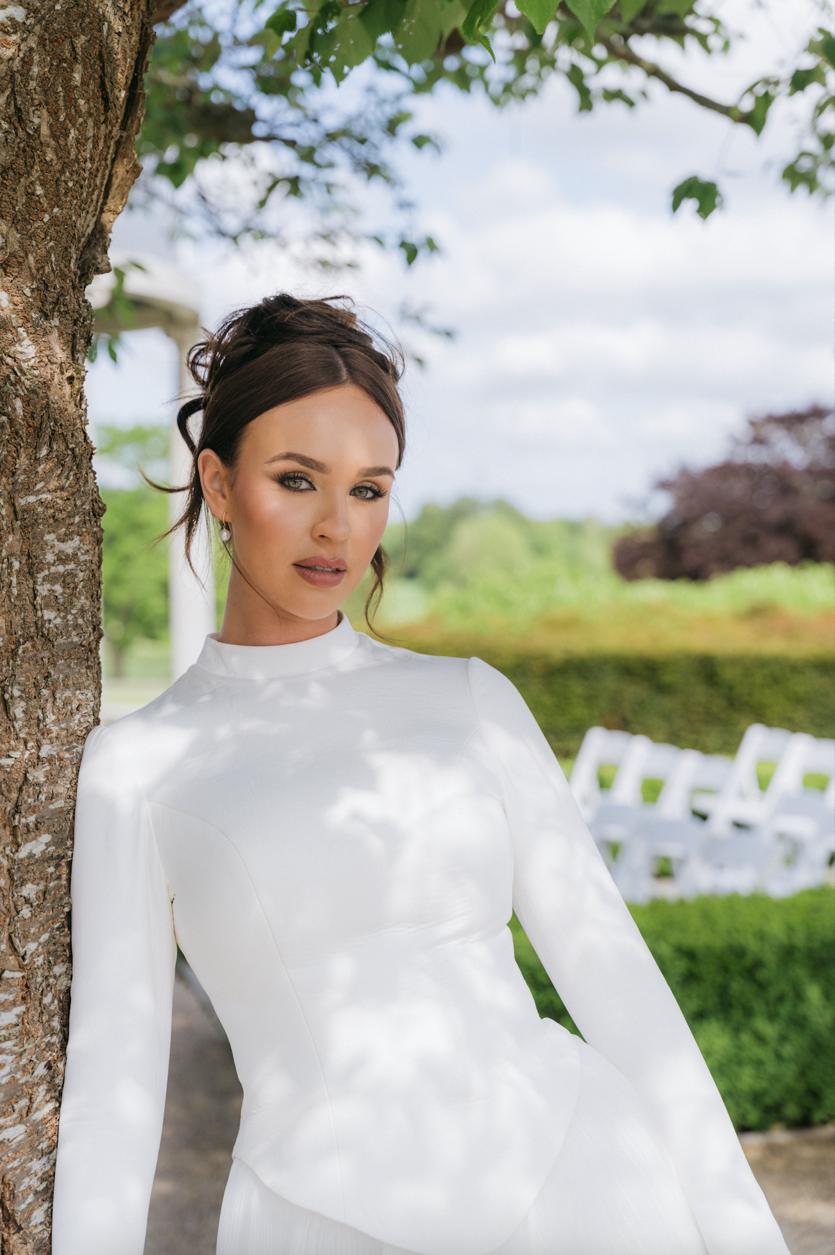 Crafted for brides who seek modest sophistication, this fully covered silhouette features a structured high neckline, fitted long sleeves, and a gently contoured bodice that flatters without revealing.