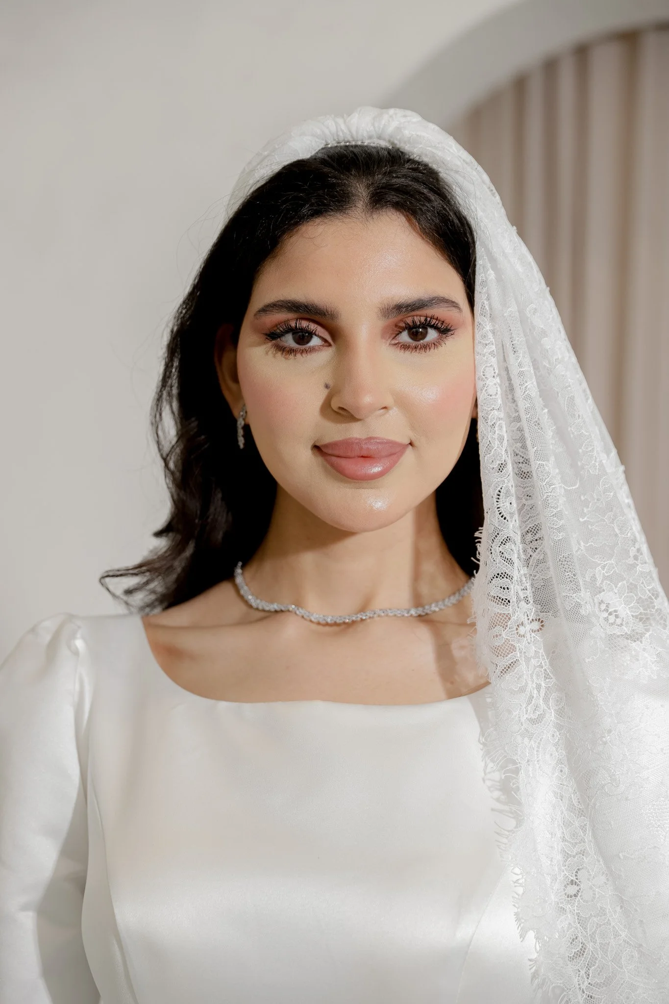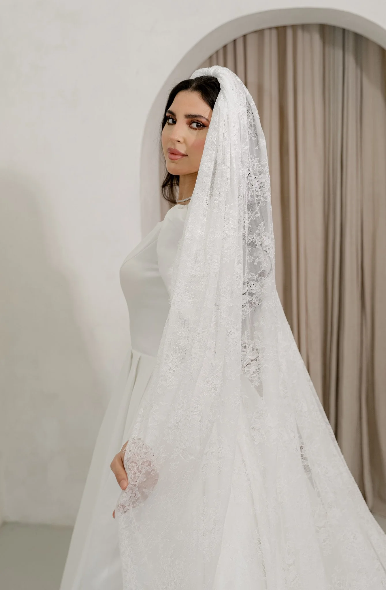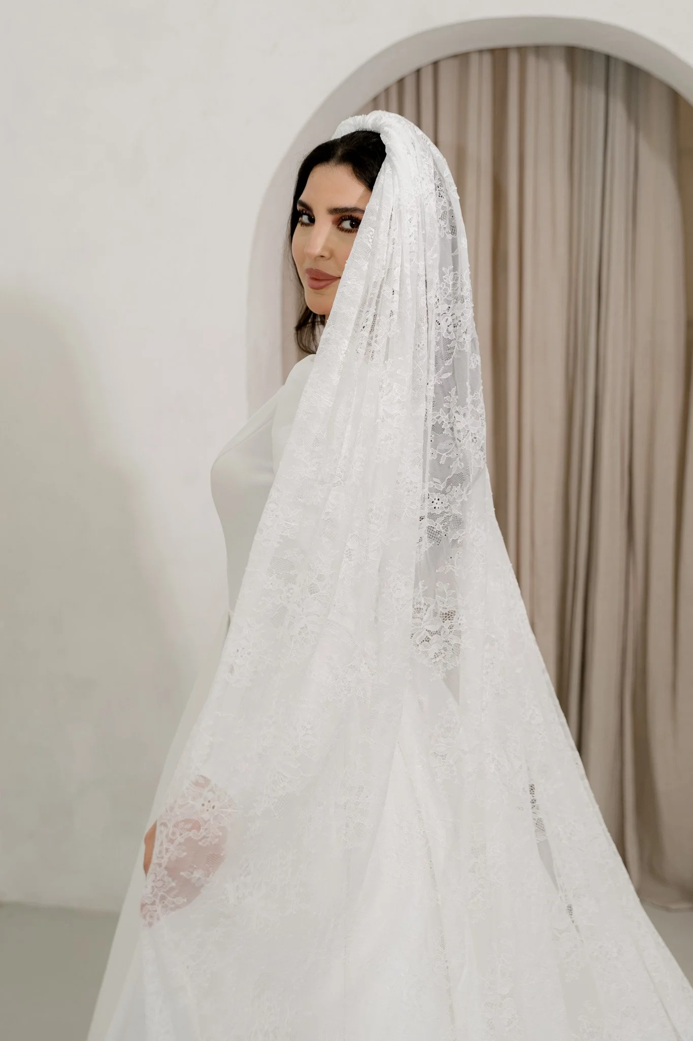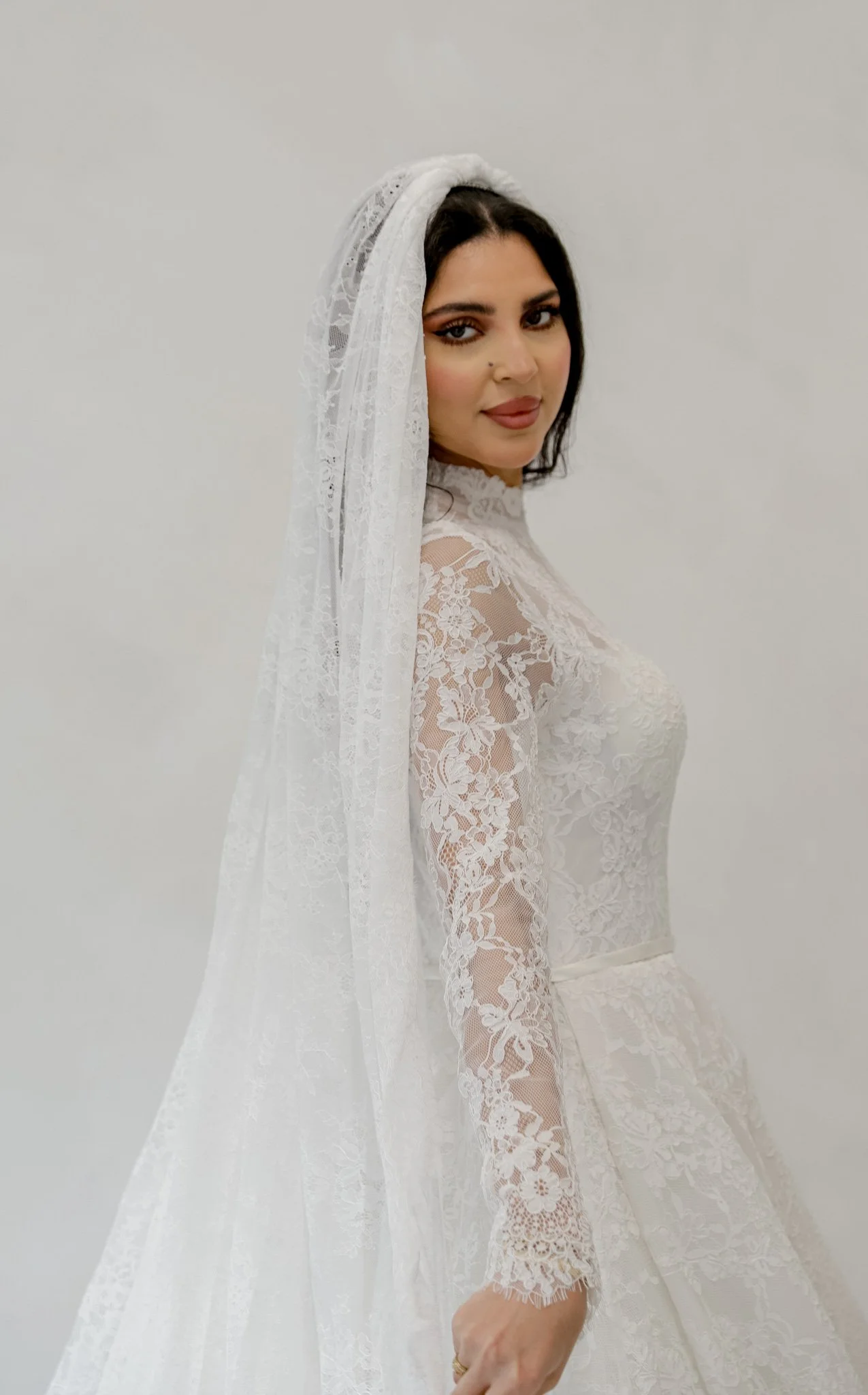 What makes Lacey particularly captivating is the way it envelopes the bride in an almost ethereal softness—subtle yet breathtaking. The intricate floral motifs woven into the lace provide texture and movement, catching the light gently and adding a graceful aura to every step. The wide lace trim frames the face and body without overpowering the gown, making it an ideal pairing for both elaborate and minimal dresses.
