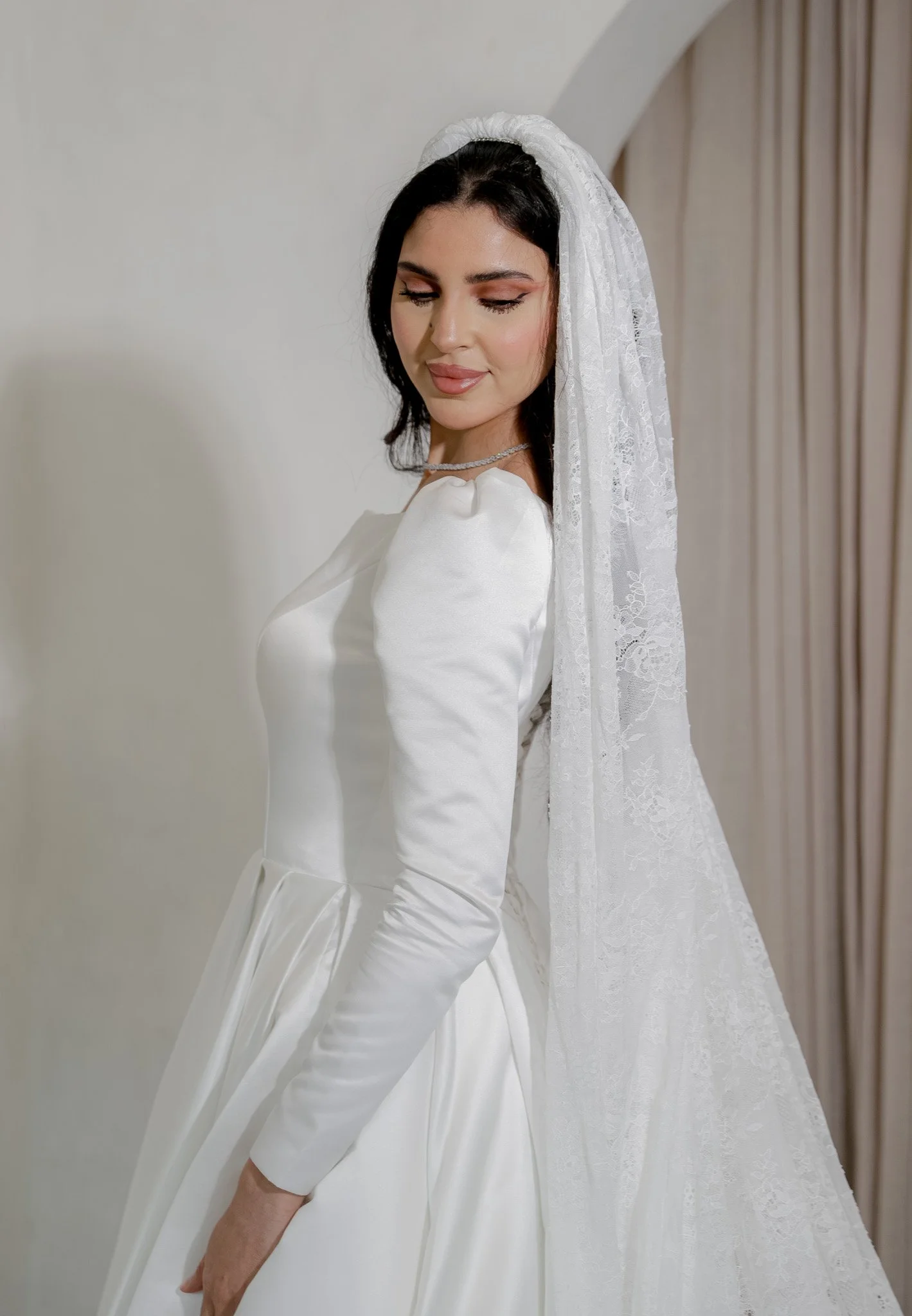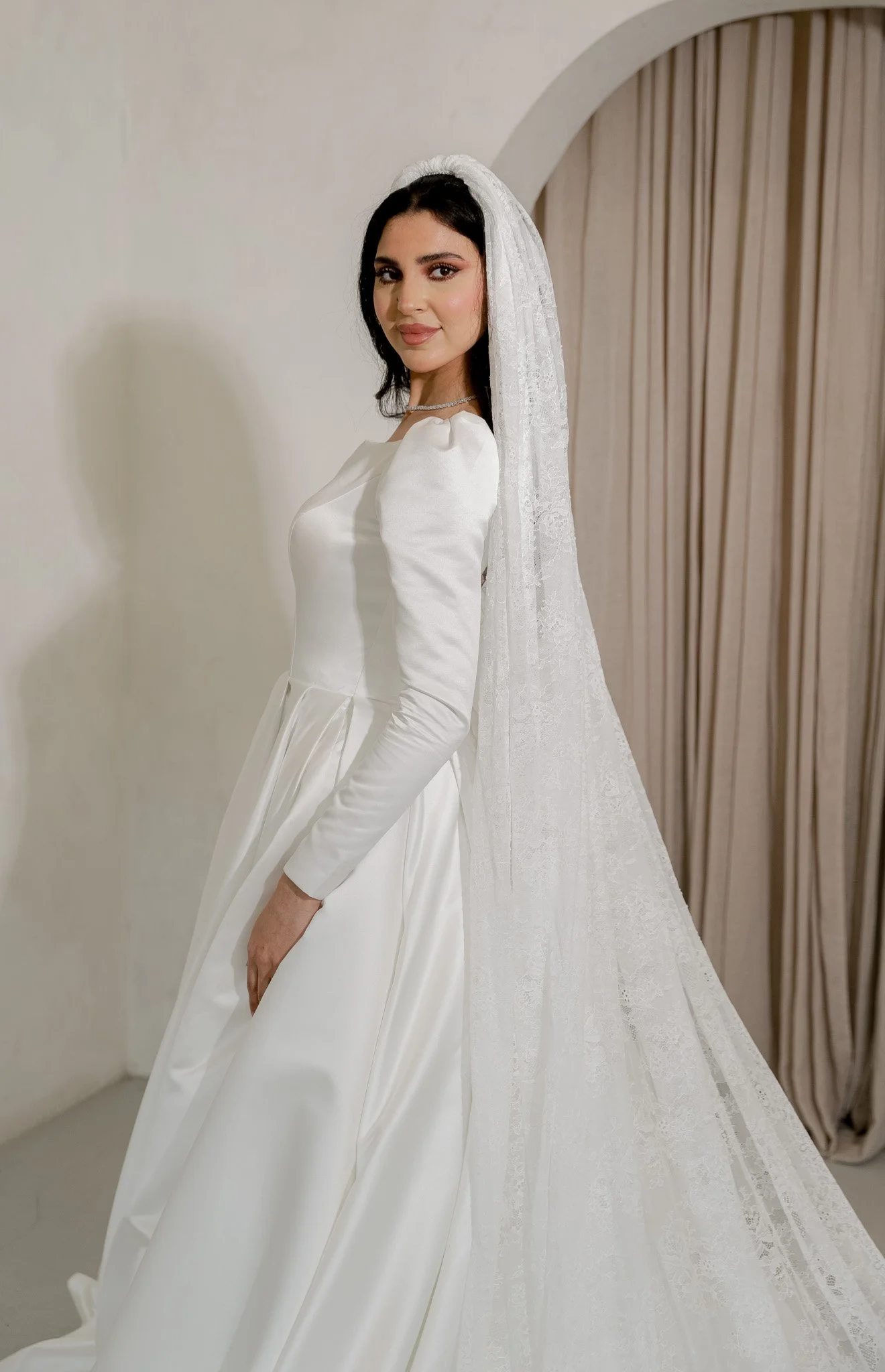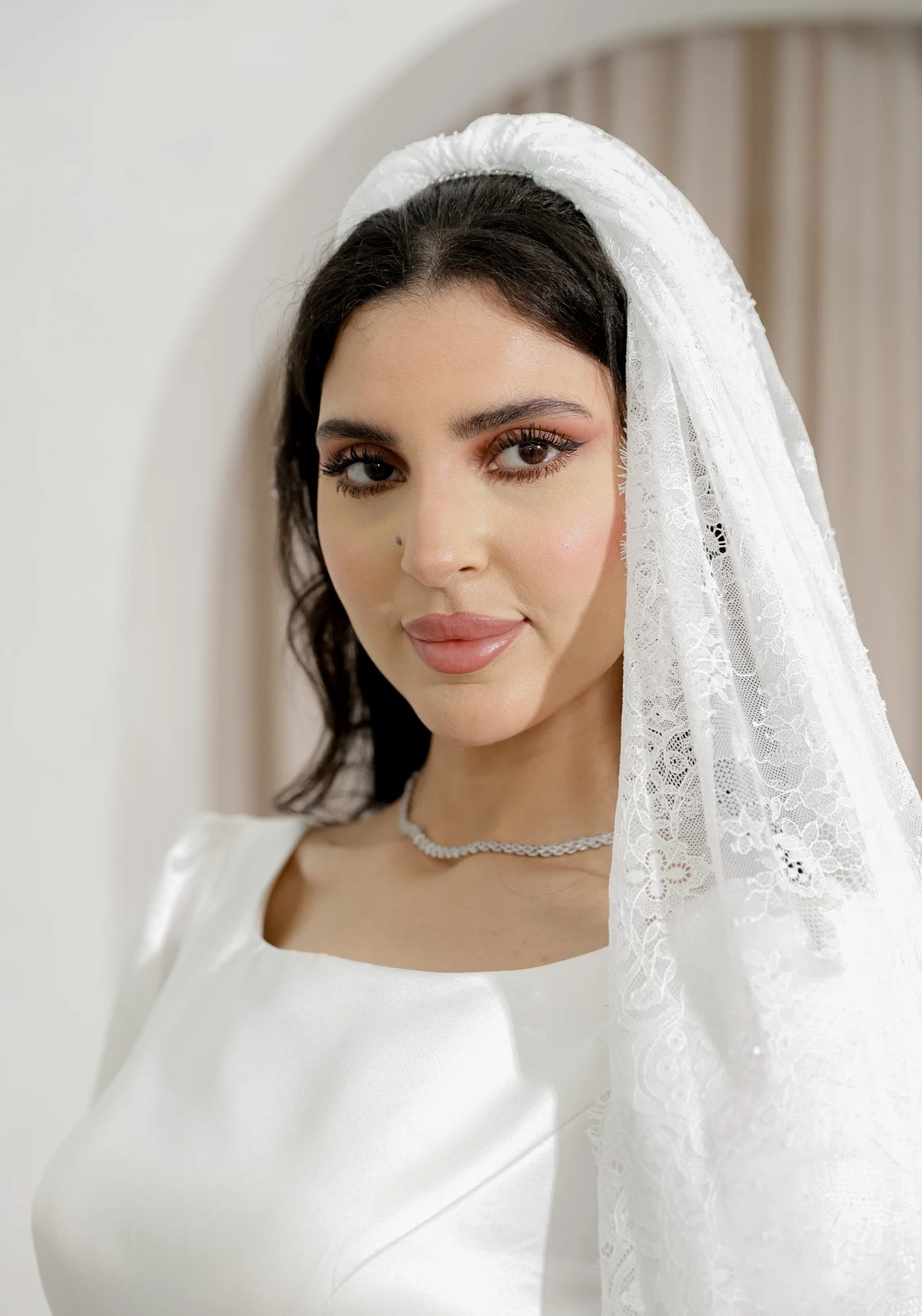 What makes Lacey particularly captivating is the way it envelopes the bride in an almost ethereal softness—subtle yet breathtaking. The intricate floral motifs woven into the lace provide texture and movement, catching the light gently and adding a graceful aura to every step. The wide lace trim frames the face and body without overpowering the gown, making it an ideal pairing for both elaborate and minimal dresses.