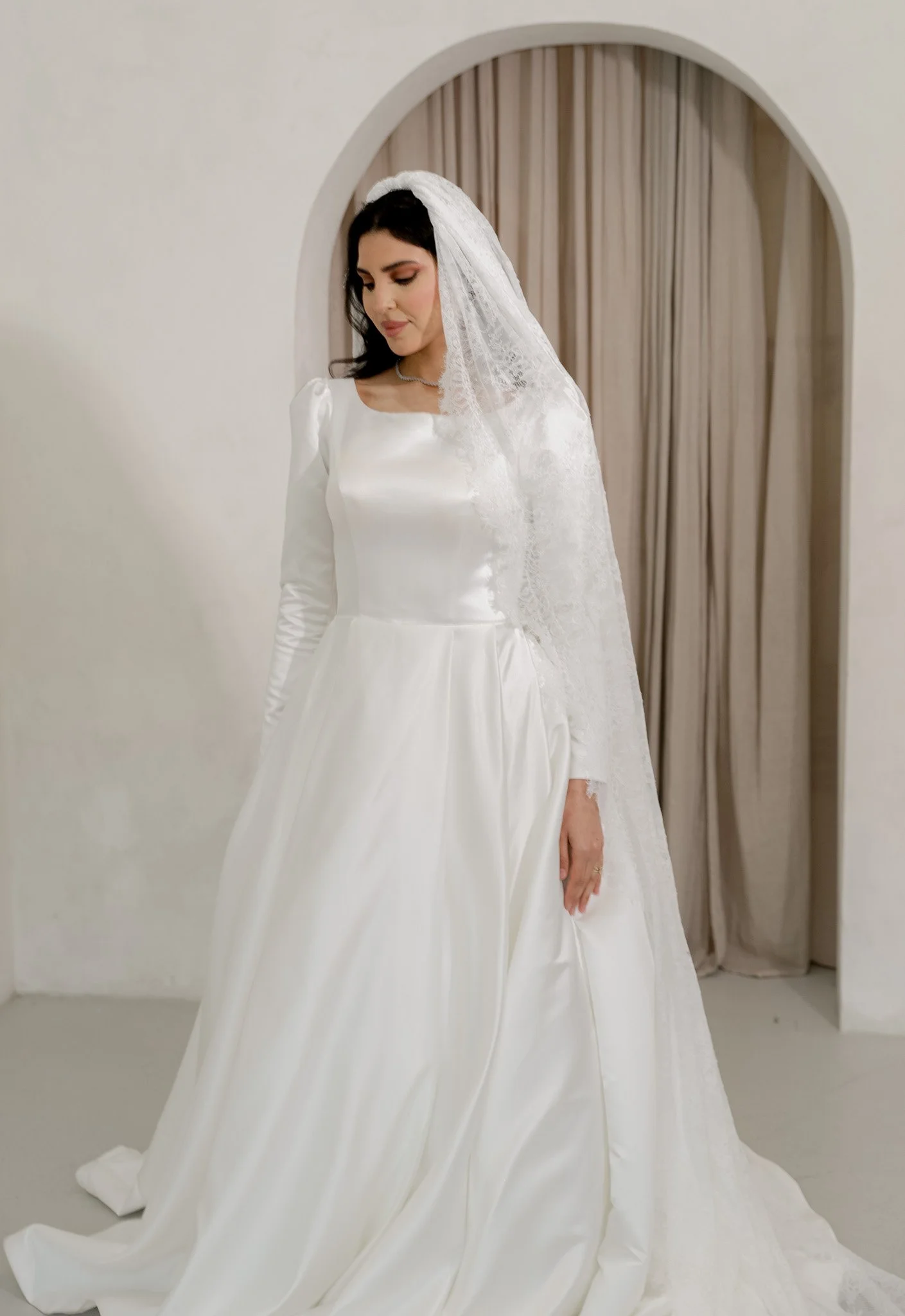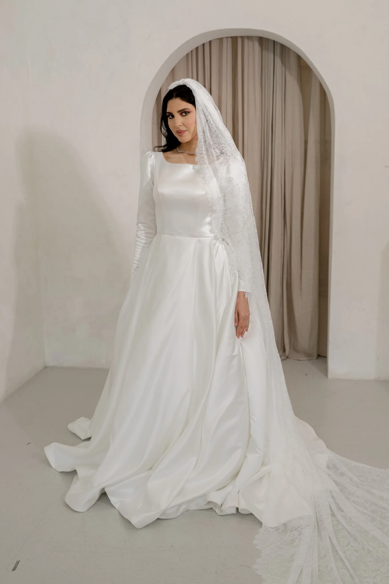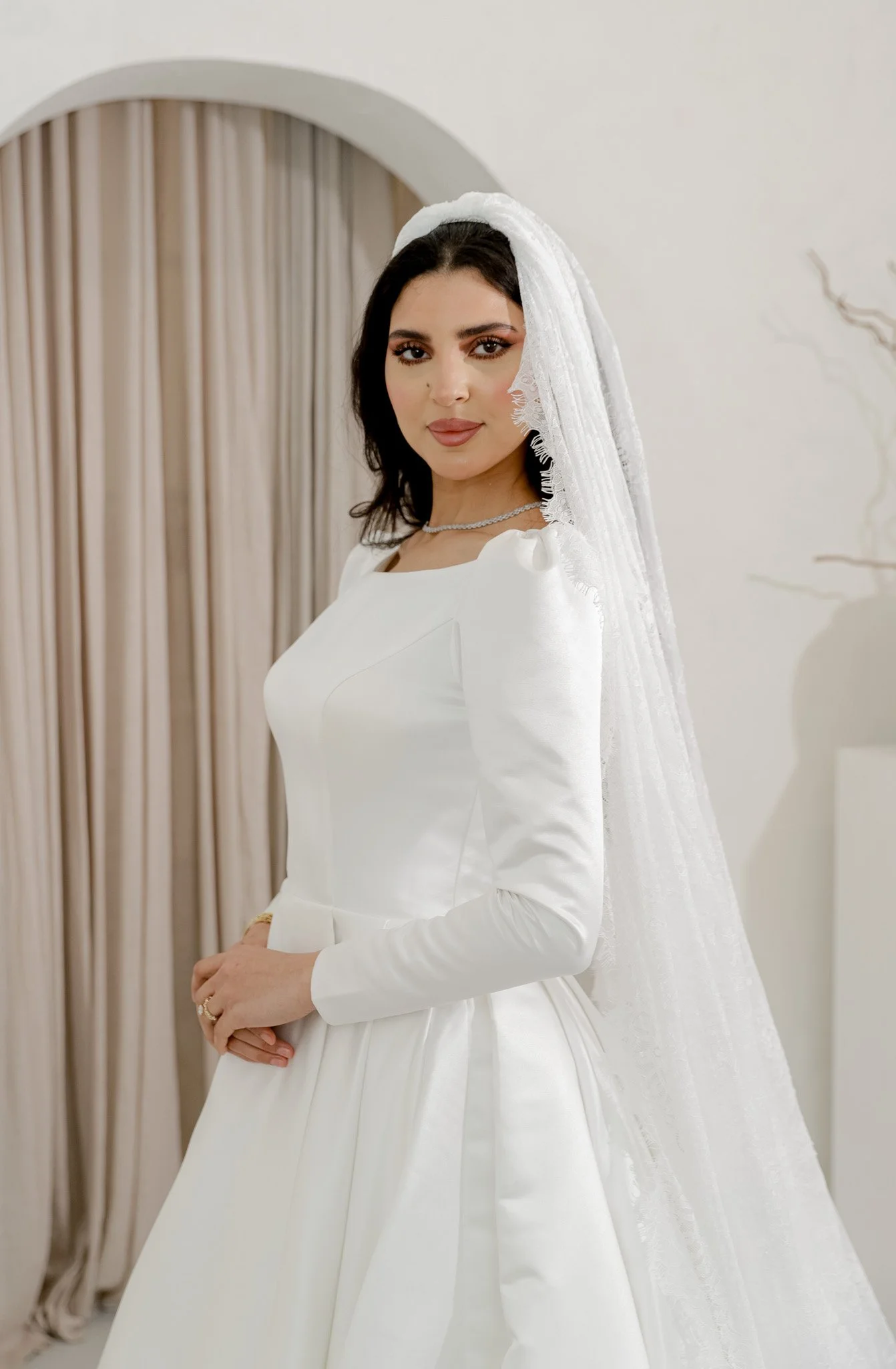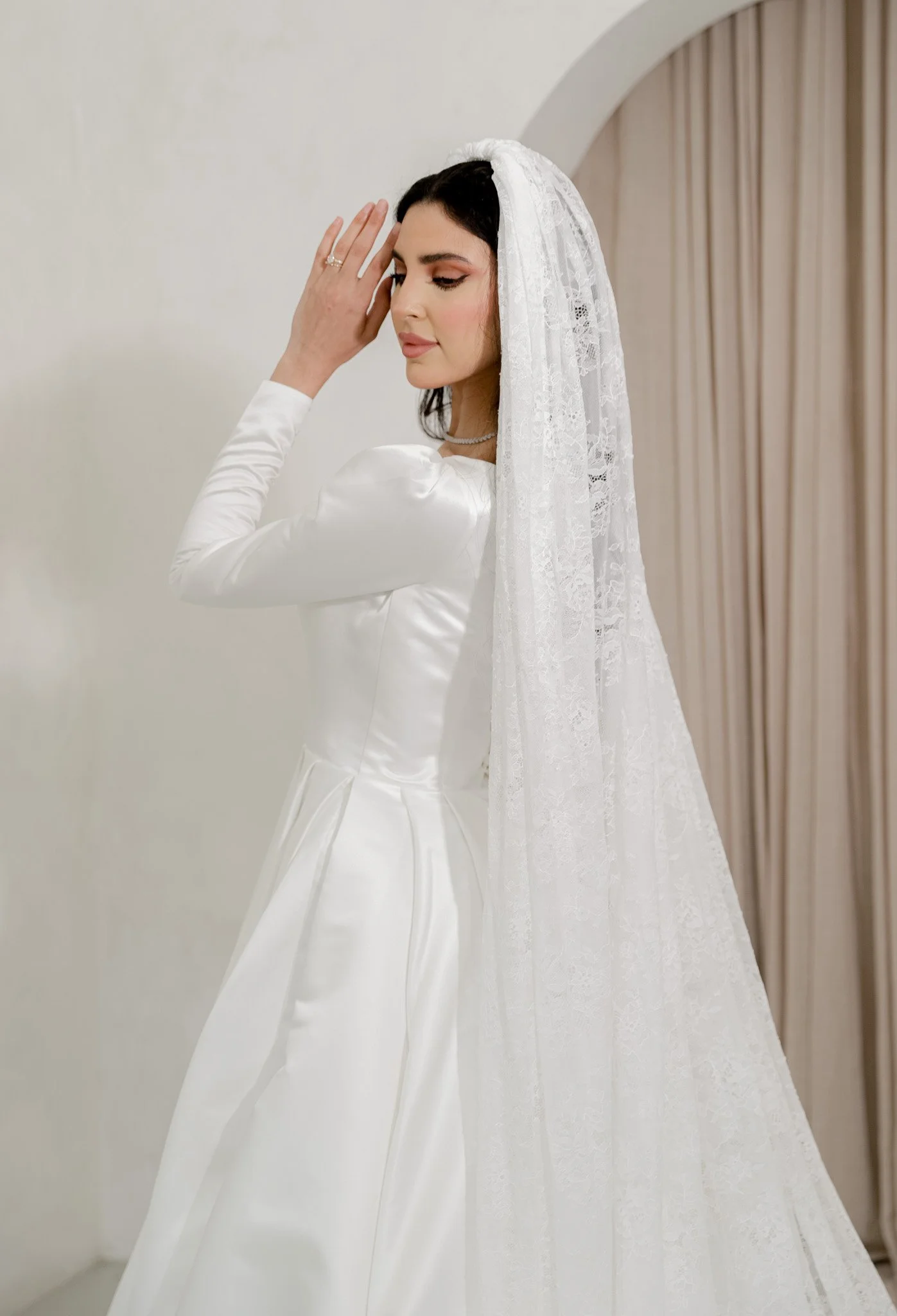 What makes Lacey particularly captivating is the way it envelopes the bride in an almost ethereal softness—subtle yet breathtaking. The intricate floral motifs woven into the lace provide texture and movement, catching the light gently and adding a graceful aura to every step. The wide lace trim frames the face and body without overpowering the gown, making it an ideal pairing for both elaborate and minimal dresses.