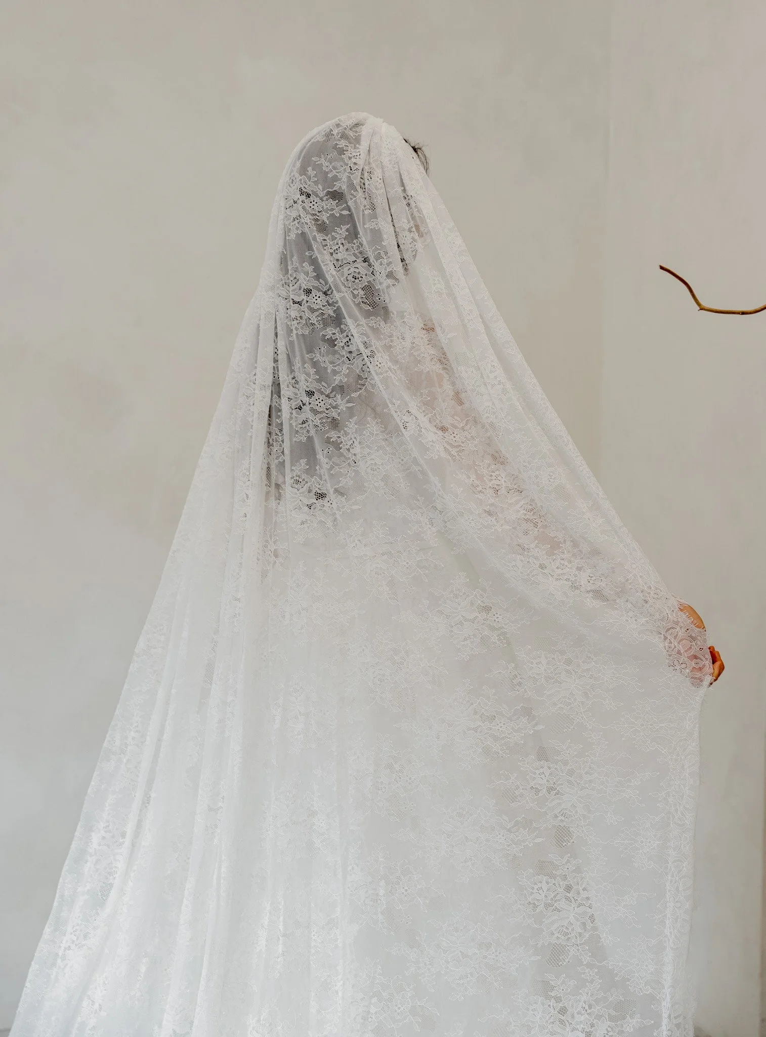 Designed for brides who value heritage with a modern spirit, the Lacey veil pays homage to vintage European bridal traditions while maintaining a lightweight and fluid drape. Whether styled with a high bun or flowing waves, this veil falls effortlessly, creating a romantic silhouette from every angle. With its dreamy aesthetic and heirloom quality, Lacey is more than just a veil—it’s a statement of timeless femininity and bridal grace