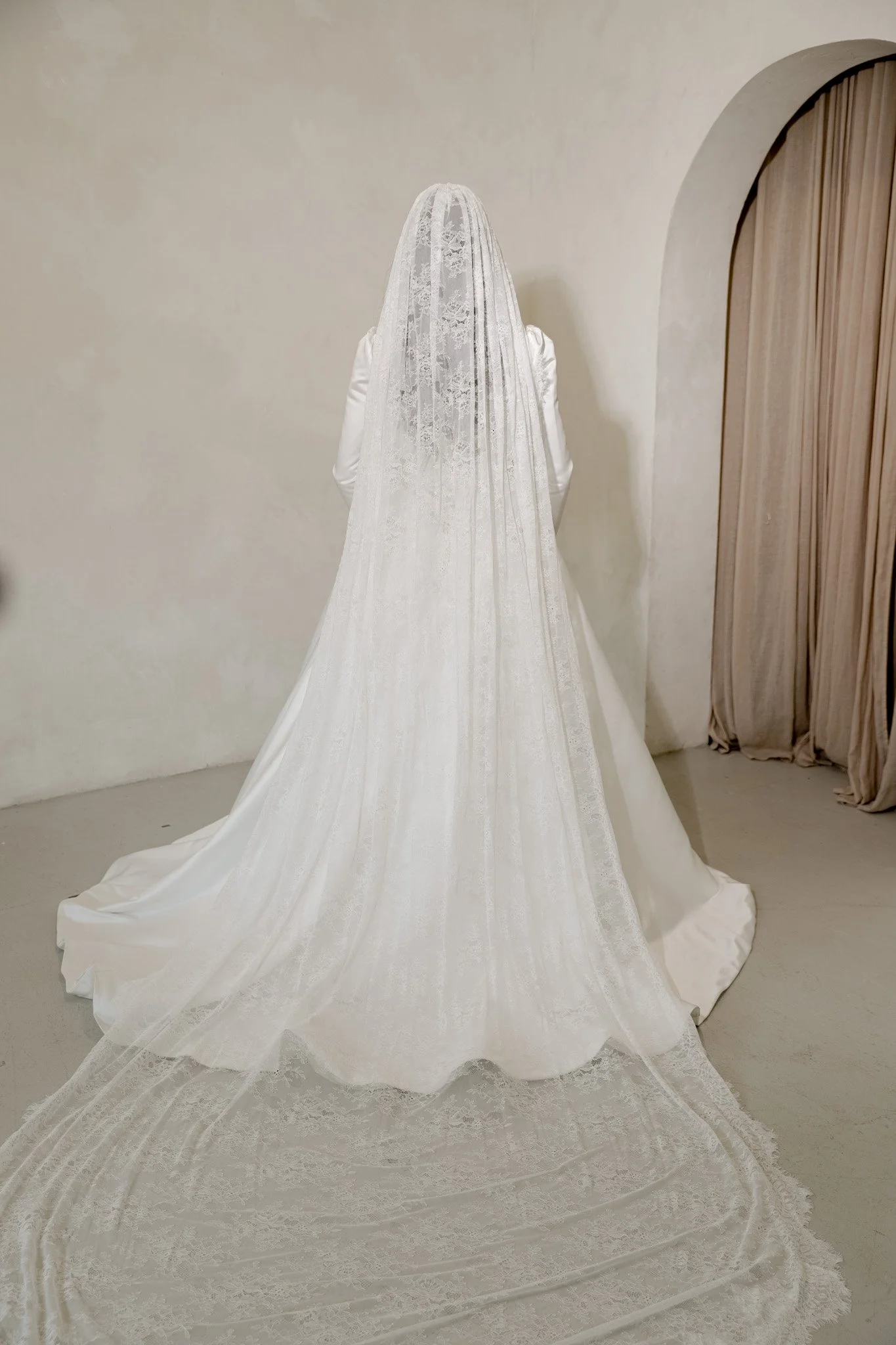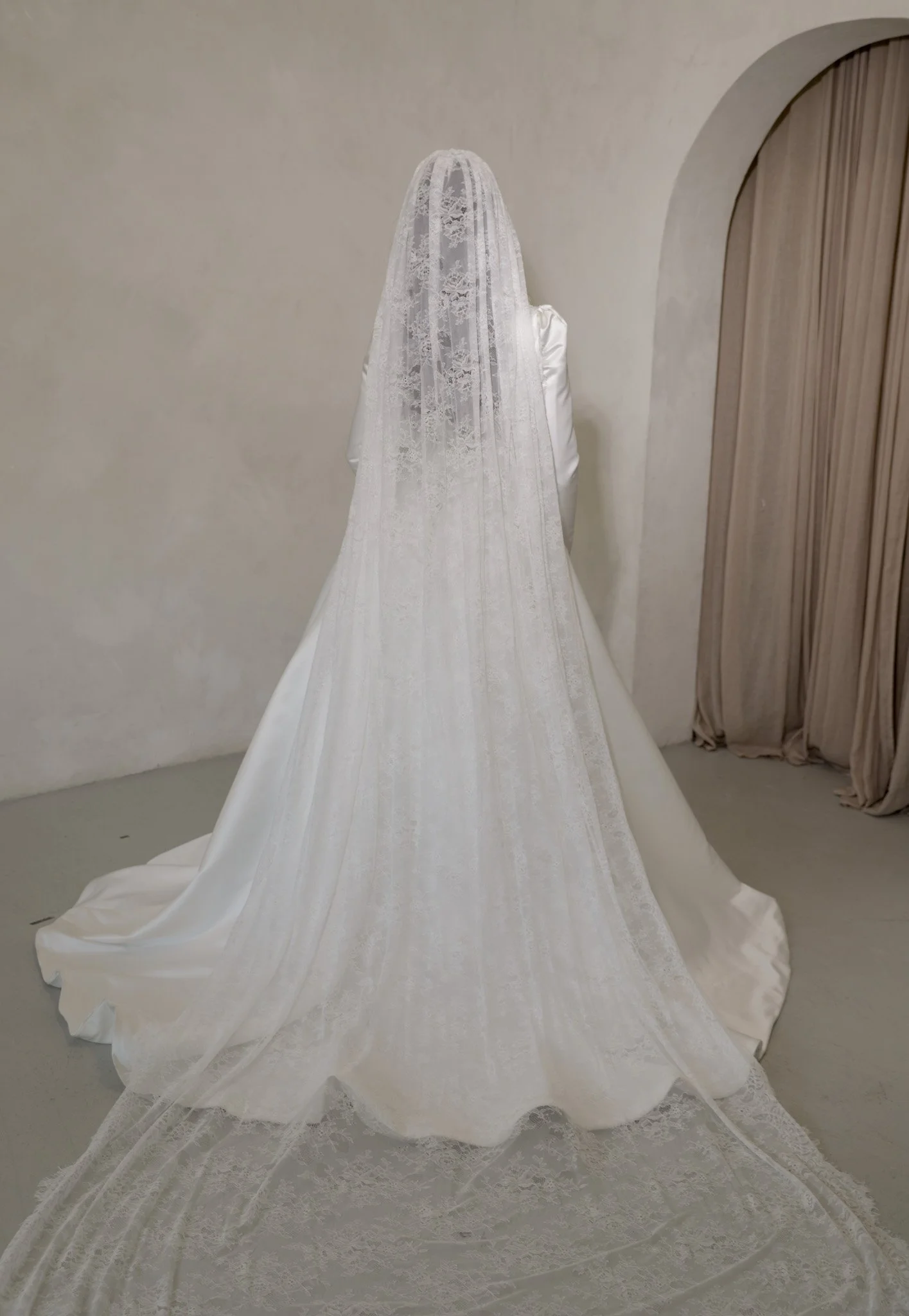 Made from exquisite soft tulle overlaid with delicate Chantilly-style lace, this cathedral-length veil exudes elegance with every inch. The lace is gracefully scattered throughout the body of the veil and finishes with a beautifully scalloped edge that adds depth and drama to the trailing hemline.